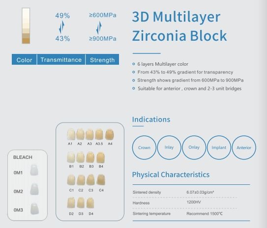 Yucera 3D Plus multilayer zirconia blok mewakili kelas tertinggi dari material zirconia, menampilkan gradasi warna alami (dari gelap ke terang), kekuatan variabel (1050MPa-700MPa),dan translucence terkontrol (43%-57%) dari bagian serviks ke incisal dalam satu blok.